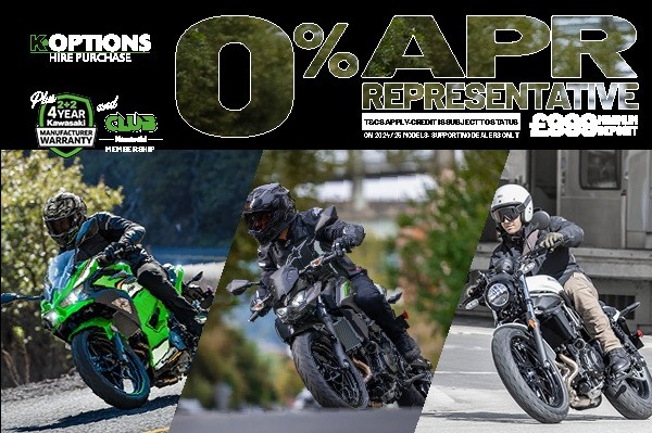 *Credit is subject to status and is only available to UK residents aged 18 and over. Only available through Kawasaki Finance, a trading style of Black Horse Ltd, St William House, Tresillian Terrace, Cardiff, CF10 5BH. Finance figures are applicable at time of print and are subject to change. Representative example based on 4,000 miles per annum. With Kawasaki Finance Personal Contract Purchase (PCP) you have the option after you have paid all of the regular monthly repayments to: (1)Return the motorcycle and not pay the Optional Final Repayment. In this example if the motorcycle has exceeded 12,333 miles, a charge of 7.2p (including VAT at 20%) will apply per excess mile. If the motorcycle is in good condition (fair wear and tear accepted) and has not exceeded 12,333 miles you will have nothing further to pay. (2)Pay the Optional Final Repayment to own the motorcycle or (3)Part exchange the motorcycle subject to settlement of your existing finance agreement; new finance agreements are subject to status.